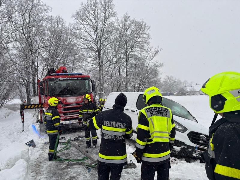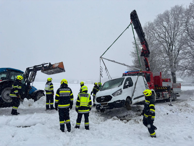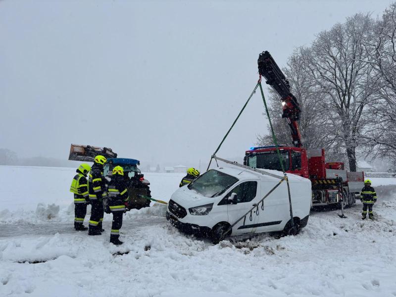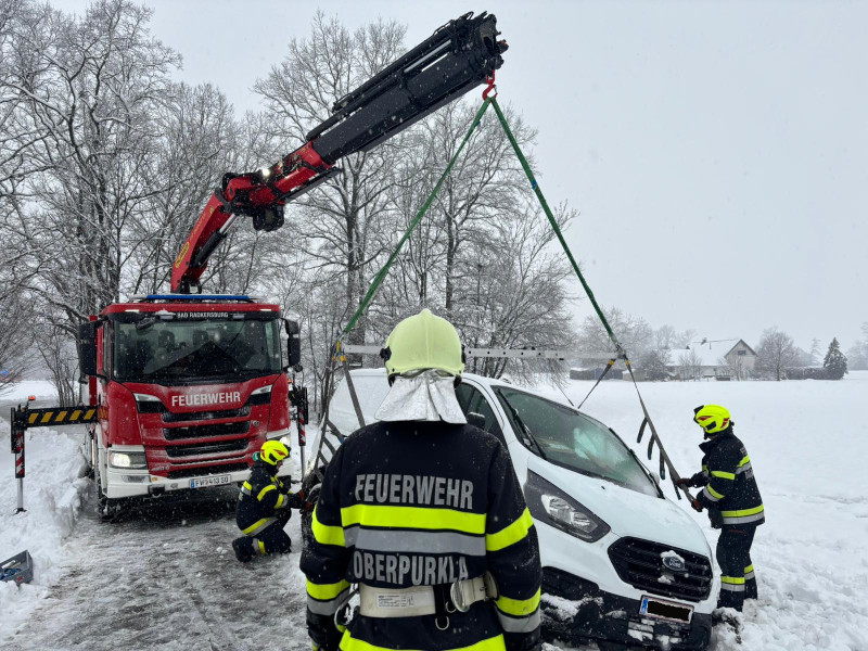 Aufgrund der winterlichen Fahrbahnbedingungen infolge der starken Schneefälle kam ein Lieferwagen von der Straße ab. Die Kameraden der FF Oberpurkla bargen das Fahrzeug unter Mithilfe des WLF-Krans der FF Bad Radkersburg sowie eines Traktors.