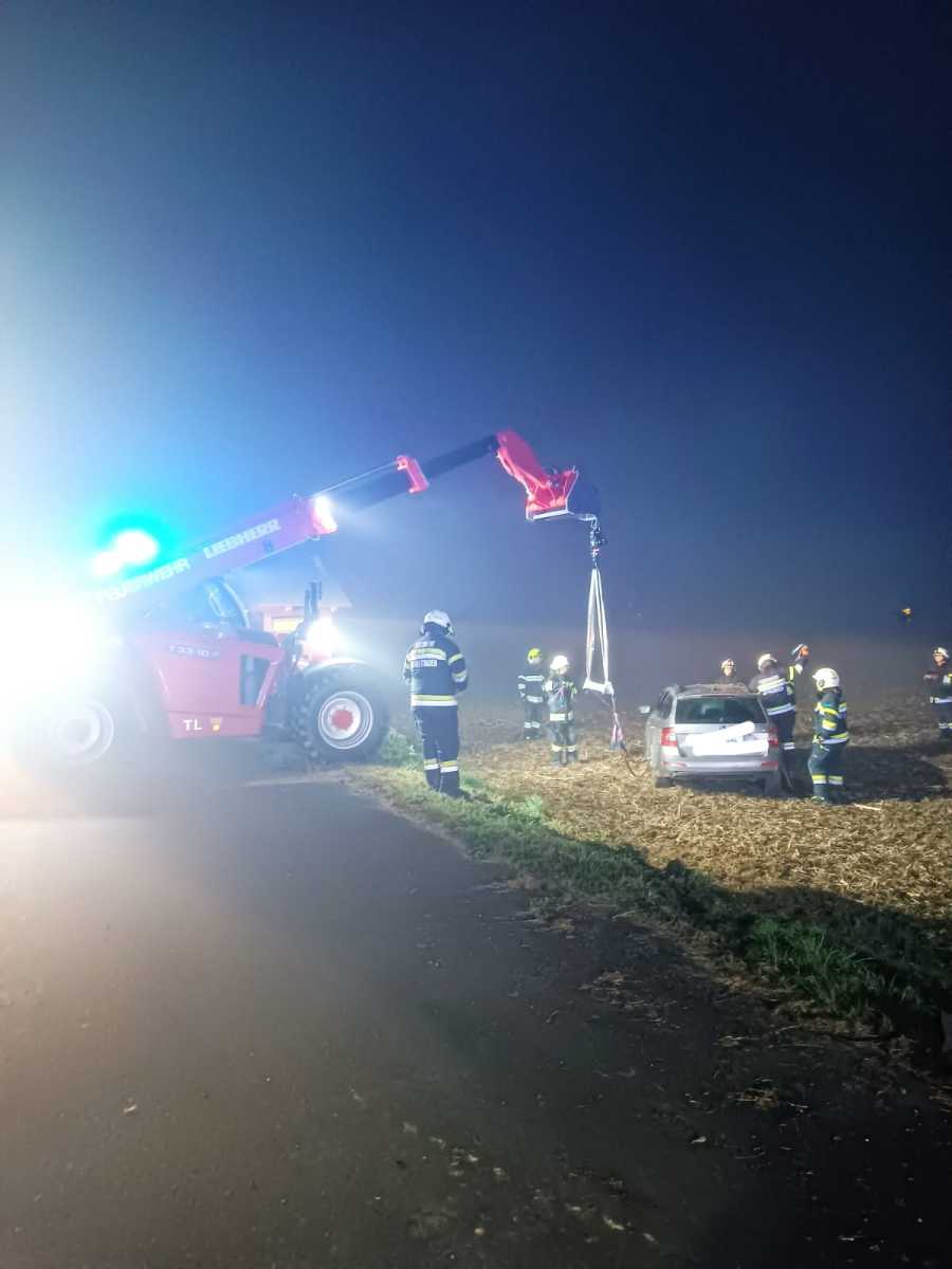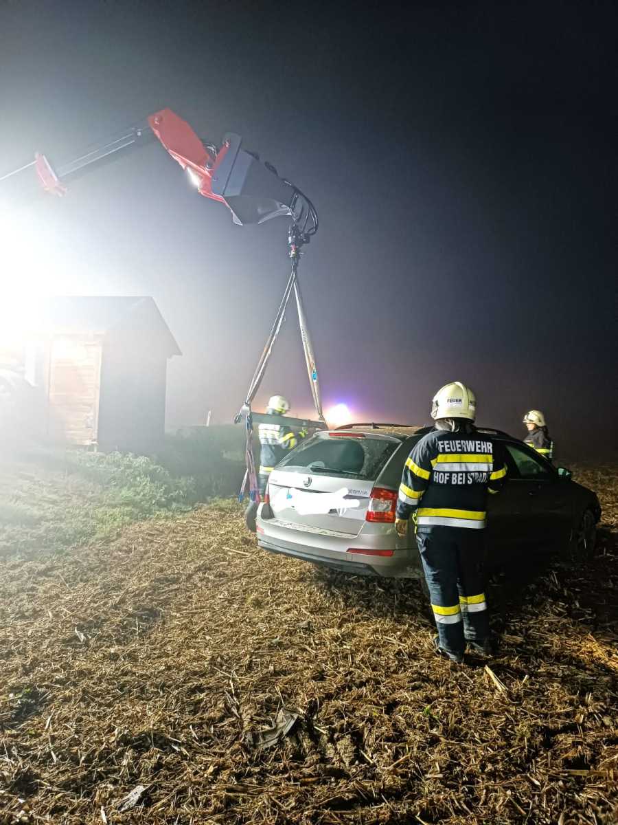 Nach der Lageerkundung durch den Einsatzleiter wurde zur Bergung des PKW die Feuerwehr Hof bei Straden mit ihrem Teleskoplader nachalarmiert.