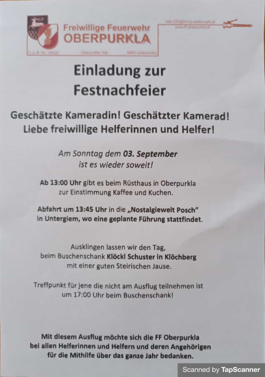 Auch dieses Jahr lud die FF Oberpurkla die zahlreichen freiwilligen Helfer ihres Gartenfests zu einem Ausflug ein. Diesmal ging es zur Nostalgiewelt Posch in Untergiem, wo zahlreiche Raritäten bewundert werden konnten. Zum Abschluss wurde noch beim Buschenschank Klöckl Schuster in Klöchberg eingekehrt.